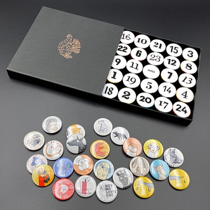 Stereohype's luxury Advent Calendar Gift Box contains 24 + 1 themed button badges – selected from Stereohype's over 1600-strong collection of designer button badges. The designs are hidden with removable stickers featuring numbers 1–24. Simply peel off the daily sticker to reveal the themed button badge artwork. Wear them, collect them, give them to a friend and spread the button badge love. Available calendar themes are Cats, Dogs, Fun, Yummy, Abstract and Monsters.