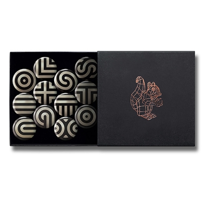 There are three different sizes of Stereohype's elegant matchbox-style gift boxes for button badges. In this category we have the medium-sized versions of this superb packaging solution. Each of these medium-sized gift boxes contain seven, eight or twelve designs from Stereohype's growing button badge collection. A rose-gold foil-blocked Stereohype mascot squirrel was hand-printed in the UK at the top of the gift box (outside dimensions, medium size for 6–12 badges: 100 x 100 x 17mm). Inside the beautiful matt black cardboard gift box is a black flock pad and badges are directly pinned into it. All Stereohype button badges available at stereohype.com are classic high quality one inch (25mm) metal back badges with so-called D-pin. Tiny stickers at the back of each button badge mention the artist, release date, series number, etc. Badges are printed and encapsulated with love and care in the United Kingdom.