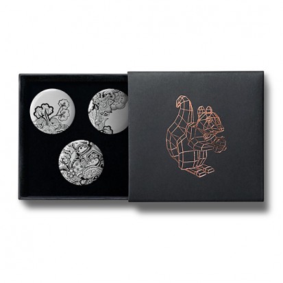 This elegant matchbox-style gift box contains three designs from Stereohype's growing button badge collection – now available for the first time in this superb packaging solution. A rose-gold foil-blocked Stereohype mascot squirrel was hand-printed in the UK at the top of the gift box (outside dimensions: 75 x 72 x 16mm). Inside the beautiful matt black cardboard gift box is a black flock pad and badges are directly pinned into it. All Stereohype button badges available at stereohype.com are classic high quality one inch (25mm) metal back badges with so-called D-pin (although it looks more like an 'e'). Tiny stickers at the back of each button badge mention the artist, release date, series number, etc. Badges are manufactured with love and care in the United Kingdom.
