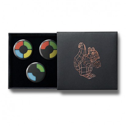 This elegant matchbox-style gift box contains three designs from Stereohype's growing button badge collection – now available for the first time in this superb packaging solution. A rose-gold foil-blocked Stereohype mascot squirrel was hand-printed in the UK at the top of the gift box (outside dimensions: 75 x 72 x 16mm). Inside the beautiful matt black cardboard gift box is a black flock pad and badges are directly pinned into it. All Stereohype button badges available at stereohype.com are classic high quality one inch (25mm) metal back badges with so-called D-pin (although it looks more like an 'e'). Tiny stickers at the back of each button badge mention the artist, release date, series number, etc. Badges are manufactured with love and care in the United Kingdom.