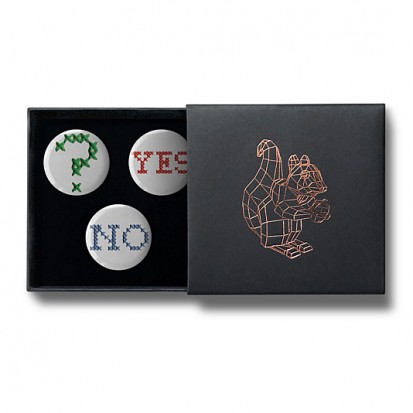 This elegant matchbox-style gift box contains three designs from Stereohype's growing button badge collection – now available for the first time in this superb packaging solution. A rose-gold foil-blocked Stereohype mascot squirrel was hand-printed in the UK at the top of the gift box (outside dimensions: 75 x 72 x 16mm). Inside the beautiful matt black cardboard gift box is a black flock pad and badges are directly pinned into it. All Stereohype button badges available at stereohype.com are classic high quality one inch (25mm) metal back badges with so-called D-pin (although it looks more like an 'e'). Tiny stickers at the back of each button badge mention the artist, release date, series number, etc. Badges are manufactured with love and care in the United Kingdom.