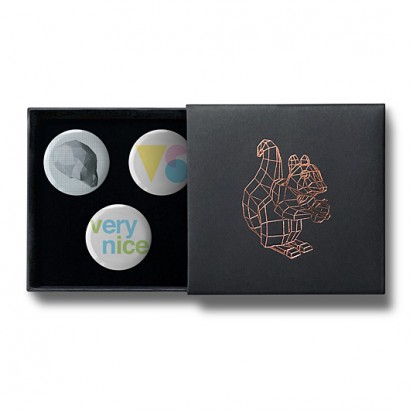 This elegant matchbox-style gift box contains three designs from Stereohype's growing button badge collection – now available for the first time in this superb packaging solution. A rose-gold foil-blocked Stereohype mascot squirrel was hand-printed in the UK at the top of the gift box (outside dimensions: 75 x 72 x 16mm). Inside the beautiful matt black cardboard gift box is a black flock pad and badges are directly pinned into it. All Stereohype button badges available at stereohype.com are classic high quality one inch (25mm) metal back badges with so-called D-pin (although it looks more like an 'e'). Tiny stickers at the back of each button badge mention the artist, release date, series number, etc. Badges are manufactured with love and care in the United Kingdom.