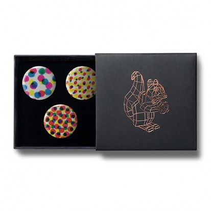 This elegant matchbox-style gift box contains three designs from Stereohype's growing button badge collection – now available for the first time in this superb packaging solution. A rose-gold foil-blocked Stereohype mascot squirrel was hand-printed in the UK at the top of the gift box (outside dimensions: 75 x 72 x 16mm). Inside the beautiful matt black cardboard gift box is a black flock pad and badges are directly pinned into it. All Stereohype button badges available at stereohype.com are classic high quality one inch (25mm) metal back badges with so-called D-pin (although it looks more like an 'e'). Tiny stickers at the back of each button badge mention the artist, release date, series number, etc. Badges are manufactured with love and care in the United Kingdom.