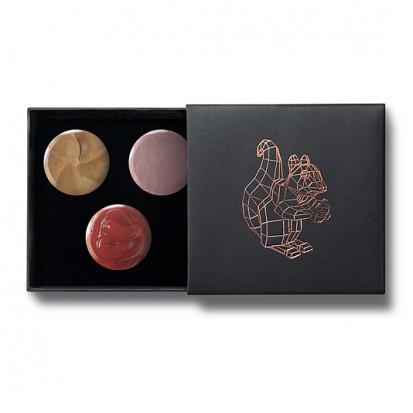 This elegant matchbox-style gift box contains three designs from Stereohype's growing button badge collection – now available for the first time in this superb packaging solution. A rose-gold foil-blocked Stereohype mascot squirrel was hand-printed in the UK at the top of the gift box (outside dimensions: 75 x 72 x 16mm). Inside the beautiful matt black cardboard gift box is a black flock pad and badges are directly pinned into it. All Stereohype button badges available at stereohype.com are classic high quality one inch (25mm) metal back badges with so-called D-pin (although it looks more like an 'e'). Tiny stickers at the back of each button badge mention the artist, release date, series number, etc. Badges are manufactured with love and care in the United Kingdom.