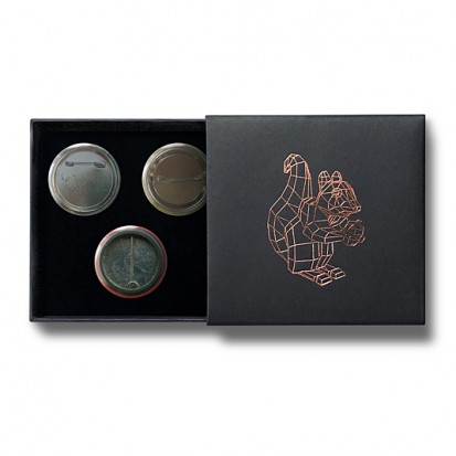 This elegant matchbox-style gift box contains three designs from Stereohype's growing button badge collection – now available for the first time in this superb packaging solution. A rose-gold foil-blocked Stereohype mascot squirrel was hand-printed in the UK at the top of the gift box (outside dimensions: 75 x 72 x 16mm). Inside the beautiful matt black cardboard gift box is a black flock pad and badges are directly pinned into it. All Stereohype button badges available at stereohype.com are classic high quality one inch (25mm) metal back badges with so-called D-pin (although it looks more like an 'e'). Tiny stickers at the back of each button badge mention the artist, release date, series number, etc. Badges are manufactured with love and care in the United Kingdom.