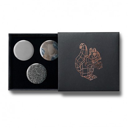 This elegant matchbox-style gift box contains three designs from Stereohype's growing button badge collection – now available for the first time in this superb packaging solution. A rose-gold foil-blocked Stereohype mascot squirrel was hand-printed in the UK at the top of the gift box (outside dimensions: 75 x 72 x 16mm). Inside the beautiful matt black cardboard gift box is a black flock pad and badges are directly pinned into it. All Stereohype button badges available at stereohype.com are classic high quality one inch (25mm) metal back badges with so-called D-pin (although it looks more like an 'e'). Tiny stickers at the back of each button badge mention the artist, release date, series number, etc. Badges are manufactured with love and care in the United Kingdom.