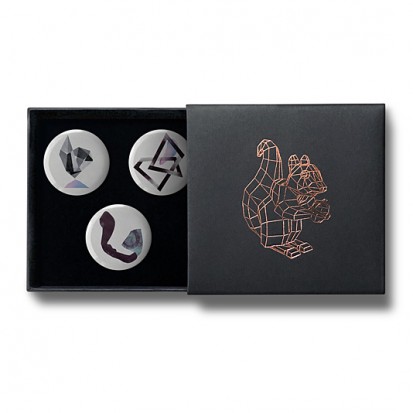 This elegant matchbox-style gift box contains three designs from Stereohype's growing button badge collection – now available for the first time in this superb packaging solution. A rose-gold foil-blocked Stereohype mascot squirrel was hand-printed in the UK at the top of the gift box (outside dimensions: 75 x 72 x 16mm). Inside the beautiful matt black cardboard gift box is a black flock pad and badges are directly pinned into it. All Stereohype button badges available at stereohype.com are classic high quality one inch (25mm) metal back badges with so-called D-pin (although it looks more like an 'e'). Tiny stickers at the back of each button badge mention the artist, release date, series number, etc. Badges are manufactured with love and care in the United Kingdom.