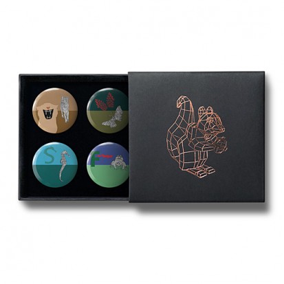 This elegant matchbox-style gift box contains four designs from Stereohype's growing button badge collection – now available for the first time in this superb packaging solution. A rose-gold foil-blocked Stereohype mascot squirrel was hand-printed in the UK at the top of the gift box (outside dimensions: 75 x 72 x 16mm). Inside the beautiful matt black cardboard gift box is a black flock pad and badges are directly pinned into it. All Stereohype button badges available at stereohype.com are classic high quality one inch (25mm) metal back badges with so-called D-pin (although it looks more like an 'e'). Tiny stickers at the back of each button badge mention the artist, release date, series number, etc. Badges are manufactured with love and care in the United Kingdom.