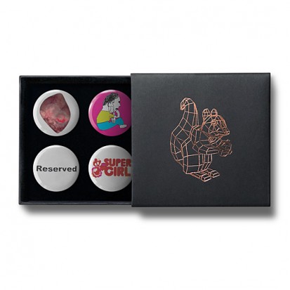 This elegant matchbox-style gift box contains four designs from Stereohype's growing button badge collection – now available for the first time in this superb packaging solution. A rose-gold foil-blocked Stereohype mascot squirrel was hand-printed in the UK at the top of the gift box (outside dimensions: 75 x 72 x 16mm). Inside the beautiful matt black cardboard gift box is a black flock pad and badges are directly pinned into it. All Stereohype button badges available at stereohype.com are classic high quality one inch (25mm) metal back badges with so-called D-pin (although it looks more like an 'e'). Tiny stickers at the back of each button badge mention the artist, release date, series number, etc. Badges are manufactured with love and care in the United Kingdom.