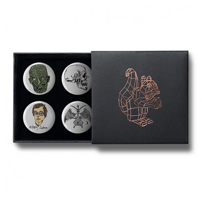 This elegant matchbox-style gift box contains four designs from Stereohype's growing button badge collection – now available for the first time in this superb packaging solution. A rose-gold foil-blocked Stereohype mascot squirrel was hand-printed in the UK at the top of the gift box (outside dimensions: 75 x 72 x 16mm). Inside the beautiful matt black cardboard gift box is a black flock pad and badges are directly pinned into it. All Stereohype button badges available at stereohype.com are classic high quality one inch (25mm) metal back badges with so-called D-pin (although it looks more like an 'e'). Tiny stickers at the back of each button badge mention the artist, release date, series number, etc. Badges are manufactured with love and care in the United Kingdom.