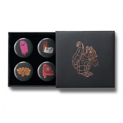 This elegant matchbox-style gift box contains four designs from Stereohype's growing button badge collection – now available for the first time in this superb packaging solution. A rose-gold foil-blocked Stereohype mascot squirrel was hand-printed in the UK at the top of the gift box (outside dimensions: 75 x 72 x 16mm). Inside the beautiful matt black cardboard gift box is a black flock pad and badges are directly pinned into it. All Stereohype button badges available at stereohype.com are classic high quality one inch (25mm) metal back badges with so-called D-pin (although it looks more like an 'e'). Tiny stickers at the back of each button badge mention the artist, release date, series number, etc. Badges are manufactured with love and care in the United Kingdom.