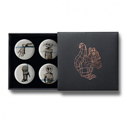 This elegant matchbox-style gift box contains four designs from Stereohype's growing button badge collection – now available for the first time in this superb packaging solution. A rose-gold foil-blocked Stereohype mascot squirrel was hand-printed in the UK at the top of the gift box (outside dimensions: 75 x 72 x 16mm). Inside the beautiful matt black cardboard gift box is a black flock pad and badges are directly pinned into it. All Stereohype button badges available at stereohype.com are classic high quality one inch (25mm) metal back badges with so-called D-pin (although it looks more like an 'e'). Tiny stickers at the back of each button badge mention the artist, release date, series number, etc. Badges are manufactured with love and care in the United Kingdom.