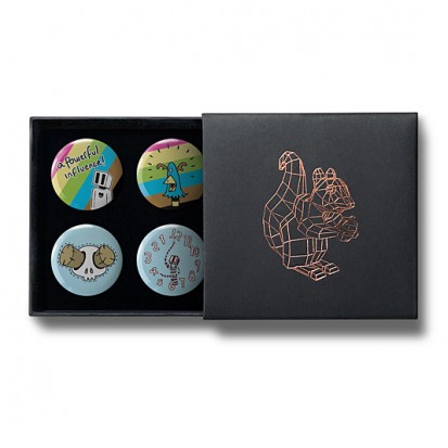 This elegant matchbox-style gift box contains four designs from Stereohype's growing button badge collection – now available for the first time in this superb packaging solution. A rose-gold foil-blocked Stereohype mascot squirrel was hand-printed in the UK at the top of the gift box (outside dimensions: 75 x 72 x 16mm). Inside the beautiful matt black cardboard gift box is a black flock pad and badges are directly pinned into it. All Stereohype button badges available at stereohype.com are classic high quality one inch (25mm) metal back badges with so-called D-pin (although it looks more like an 'e'). Tiny stickers at the back of each button badge mention the artist, release date, series number, etc. Badges are manufactured with love and care in the United Kingdom.