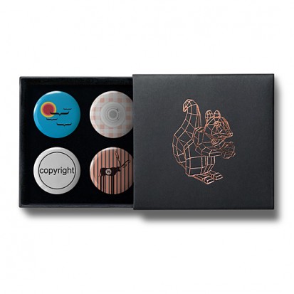 This elegant matchbox-style gift box contains four designs from Stereohype's growing button badge collection – now available for the first time in this superb packaging solution. A rose-gold foil-blocked Stereohype mascot squirrel was hand-printed in the UK at the top of the gift box (outside dimensions: 75 x 72 x 16mm). Inside the beautiful matt black cardboard gift box is a black flock pad and badges are directly pinned into it. All Stereohype button badges available at stereohype.com are classic high quality one inch (25mm) metal back badges with so-called D-pin (although it looks more like an 'e'). Tiny stickers at the back of each button badge mention the artist, release date, series number, etc. Badges are manufactured with love and care in the United Kingdom.