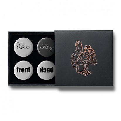 This elegant matchbox-style gift box contains four designs from Stereohype's growing button badge collection – now available for the first time in this superb packaging solution. A rose-gold foil-blocked Stereohype mascot squirrel was hand-printed in the UK at the top of the gift box (outside dimensions: 75 x 72 x 16mm). Inside the beautiful matt black cardboard gift box is a black flock pad and badges are directly pinned into it. All Stereohype button badges available at stereohype.com are classic high quality one inch (25mm) metal back badges with so-called D-pin (although it looks more like an 'e'). Tiny stickers at the back of each button badge mention the artist, release date, series number, etc. Badges are manufactured with love and care in the United Kingdom.