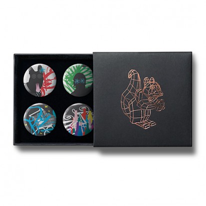 This elegant matchbox-style gift box contains four designs from Stereohype's growing button badge collection – now available for the first time in this superb packaging solution. A rose-gold foil-blocked Stereohype mascot squirrel was hand-printed in the UK at the top of the gift box (outside dimensions: 75 x 72 x 16mm). Inside the beautiful matt black cardboard gift box is a black flock pad and badges are directly pinned into it. All Stereohype button badges available at stereohype.com are classic high quality one inch (25mm) metal back badges with so-called D-pin (although it looks more like an 'e'). Tiny stickers at the back of each button badge mention the artist, release date, series number, etc. Badges are manufactured with love and care in the United Kingdom.