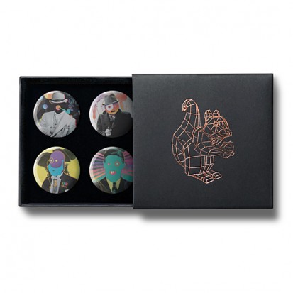 This elegant matchbox-style gift box contains four designs from Stereohype's growing button badge collection – now available for the first time in this superb packaging solution. A rose-gold foil-blocked Stereohype mascot squirrel was hand-printed in the UK at the top of the gift box (outside dimensions: 75 x 72 x 16mm). Inside the beautiful matt black cardboard gift box is a black flock pad and badges are directly pinned into it. All Stereohype button badges available at stereohype.com are classic high quality one inch (25mm) metal back badges with so-called D-pin (although it looks more like an 'e'). Tiny stickers at the back of each button badge mention the artist, release date, series number, etc. Badges are manufactured with love and care in the United Kingdom.