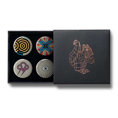This elegant matchbox-style gift box contains four designs from Stereohype's growing button badge collection – now available for the first time in this superb packaging solution. A rose-gold foil-blocked Stereohype mascot squirrel was hand-printed in the UK at the top of the gift box (outside dimensions: 75 x 72 x 16mm). Inside the beautiful matt black cardboard gift box is a black flock pad and badges are directly pinned into it. All Stereohype button badges available at stereohype.com are classic high quality one inch (25mm) metal back badges with so-called D-pin (although it looks more like an 'e'). Tiny stickers at the back of each button badge mention the artist, release date, series number, etc. Badges are manufactured with love and care in the United Kingdom.