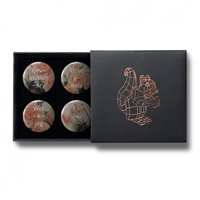 This elegant matchbox-style gift box contains four designs from Stereohype's growing button badge collection – now available for the first time in this superb packaging solution. A rose-gold foil-blocked Stereohype mascot squirrel was hand-printed in the UK at the top of the gift box (outside dimensions: 75 x 72 x 16mm). Inside the beautiful matt black cardboard gift box is a black flock pad and badges are directly pinned into it. All Stereohype button badges available at stereohype.com are classic high quality one inch (25mm) metal back badges with so-called D-pin (although it looks more like an 'e'). Tiny stickers at the back of each button badge mention the artist, release date, series number, etc. Badges are manufactured with love and care in the United Kingdom.