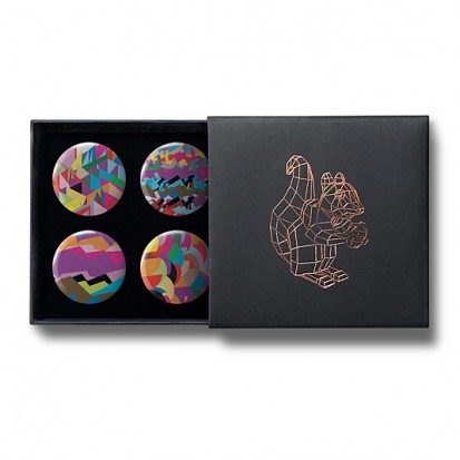 This elegant matchbox-style gift box contains four designs from Stereohype's growing button badge collection – now available for the first time in this superb packaging solution. A rose-gold foil-blocked Stereohype mascot squirrel was hand-printed in the UK at the top of the gift box (outside dimensions: 75 x 72 x 16mm). Inside the beautiful matt black cardboard gift box is a black flock pad and badges are directly pinned into it. All Stereohype button badges available at stereohype.com are classic high quality one inch (25mm) metal back badges with so-called D-pin (although it looks more like an 'e'). Tiny stickers at the back of each button badge mention the artist, release date, series number, etc. Badges are manufactured with love and care in the United Kingdom.