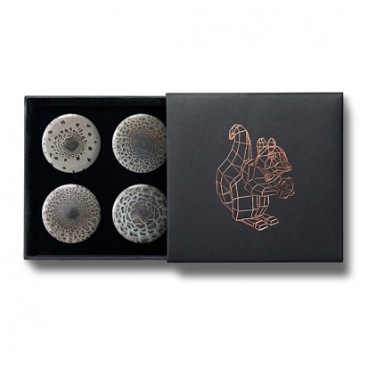 This elegant matchbox-style gift box contains four designs from Stereohype's growing button badge collection – now available for the first time in this superb packaging solution. A rose-gold foil-blocked Stereohype mascot squirrel was hand-printed in the UK at the top of the gift box (outside dimensions: 75 x 72 x 16mm). Inside the beautiful matt black cardboard gift box is a black flock pad and badges are directly pinned into it. All Stereohype button badges available at stereohype.com are classic high quality one inch (25mm) metal back badges with so-called D-pin (although it looks more like an 'e'). Tiny stickers at the back of each button badge mention the artist, release date, series number, etc. Badges are manufactured with love and care in the United Kingdom.