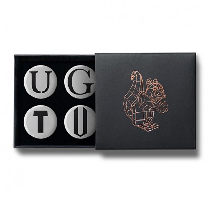 This elegant matchbox-style gift box contains four designs from Stereohype's growing button badge collection – now available for the first time in this superb packaging solution. A rose-gold foil-blocked Stereohype mascot squirrel was hand-printed in the UK at the top of the gift box (outside dimensions: 75 x 72 x 16mm). Inside the beautiful matt black cardboard gift box is a black flock pad and badges are directly pinned into it. All Stereohype button badges available at stereohype.com are classic high quality one inch (25mm) metal back badges with so-called D-pin (although it looks more like an 'e'). Tiny stickers at the back of each button badge mention the artist, release date, series number, etc. Badges are manufactured with love and care in the United Kingdom.