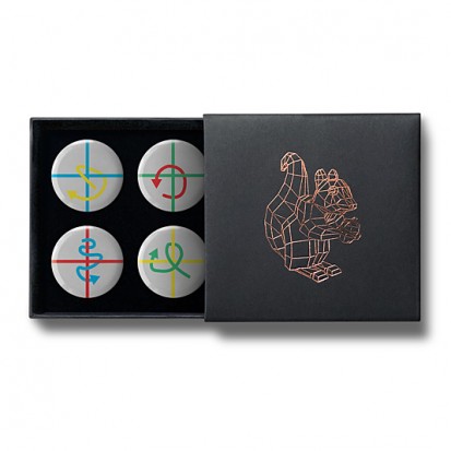 This elegant matchbox-style gift box contains four designs from Stereohype's growing button badge collection – now available for the first time in this superb packaging solution. A rose-gold foil-blocked Stereohype mascot squirrel was hand-printed in the UK at the top of the gift box (outside dimensions: 75 x 72 x 16mm). Inside the beautiful matt black cardboard gift box is a black flock pad and badges are directly pinned into it. All Stereohype button badges available at stereohype.com are classic high quality one inch (25mm) metal back badges with so-called D-pin (although it looks more like an 'e'). Tiny stickers at the back of each button badge mention the artist, release date, series number, etc. Badges are manufactured with love and care in the United Kingdom.