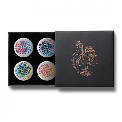 This elegant matchbox-style gift box contains four designs from Stereohype's growing button badge collection – now available for the first time in this superb packaging solution. A rose-gold foil-blocked Stereohype mascot squirrel was hand-printed in the UK at the top of the gift box (outside dimensions: 75 x 72 x 16mm). Inside the beautiful matt black cardboard gift box is a black flock pad and badges are directly pinned into it. All Stereohype button badges available at stereohype.com are classic high quality one inch (25mm) metal back badges with so-called D-pin (although it looks more like an 'e'). Tiny stickers at the back of each button badge mention the artist, release date, series number, etc. Badges are manufactured with love and care in the United Kingdom.