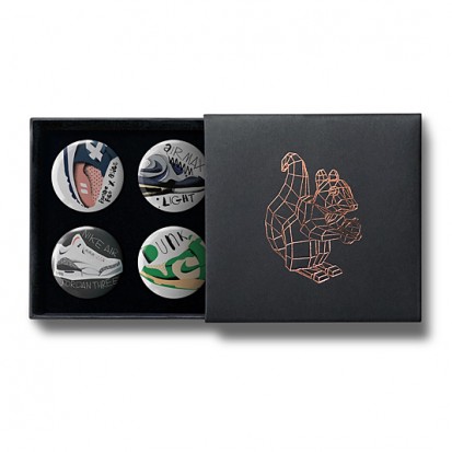 This elegant matchbox-style gift box contains four designs from Stereohype's growing button badge collection – now available for the first time in this superb packaging solution. A rose-gold foil-blocked Stereohype mascot squirrel was hand-printed in the UK at the top of the gift box (outside dimensions: 75 x 72 x 16mm). Inside the beautiful matt black cardboard gift box is a black flock pad and badges are directly pinned into it. All Stereohype button badges available at stereohype.com are classic high quality one inch (25mm) metal back badges with so-called D-pin (although it looks more like an 'e'). Tiny stickers at the back of each button badge mention the artist, release date, series number, etc. Badges are manufactured with love and care in the United Kingdom.