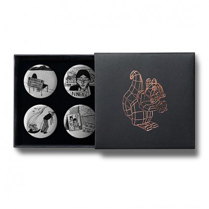This elegant matchbox-style gift box contains four designs from Stereohype's growing button badge collection – now available for the first time in this superb packaging solution. A rose-gold foil-blocked Stereohype mascot squirrel was hand-printed in the UK at the top of the gift box (outside dimensions: 75 x 72 x 16mm). Inside the beautiful matt black cardboard gift box is a black flock pad and badges are directly pinned into it. All Stereohype button badges available at stereohype.com are classic high quality one inch (25mm) metal back badges with so-called D-pin (although it looks more like an 'e'). Tiny stickers at the back of each button badge mention the artist, release date, series number, etc. Badges are manufactured with love and care in the United Kingdom.
