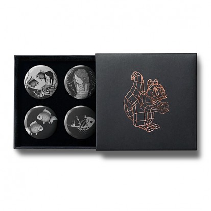 This elegant matchbox-style gift box contains four designs from Stereohype's growing button badge collection – now available for the first time in this superb packaging solution. A rose-gold foil-blocked Stereohype mascot squirrel was hand-printed in the UK at the top of the gift box (outside dimensions: 75 x 72 x 16mm). Inside the beautiful matt black cardboard gift box is a black flock pad and badges are directly pinned into it. All Stereohype button badges available at stereohype.com are classic high quality one inch (25mm) metal back badges with so-called D-pin (although it looks more like an 'e'). Tiny stickers at the back of each button badge mention the artist, release date, series number, etc. Badges are manufactured with love and care in the United Kingdom.