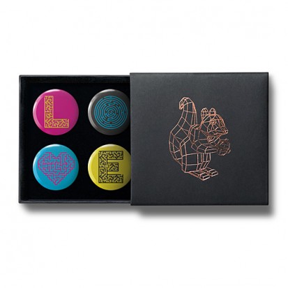 This elegant matchbox-style gift box contains four designs from Stereohype's growing button badge collection – now available for the first time in this superb packaging solution. A rose-gold foil-blocked Stereohype mascot squirrel was hand-printed in the UK at the top of the gift box (outside dimensions: 75 x 72 x 16mm). Inside the beautiful matt black cardboard gift box is a black flock pad and badges are directly pinned into it. All Stereohype button badges available at stereohype.com are classic high quality one inch (25mm) metal back badges with so-called D-pin (although it looks more like an 'e'). Tiny stickers at the back of each button badge mention the artist, release date, series number, etc. Badges are manufactured with love and care in the United Kingdom.