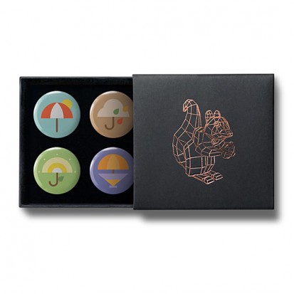 This elegant matchbox-style gift box contains four designs from Stereohype's growing button badge collection – now available for the first time in this superb packaging solution. A rose-gold foil-blocked Stereohype mascot squirrel was hand-printed in the UK at the top of the gift box (outside dimensions: 75 x 72 x 16mm). Inside the beautiful matt black cardboard gift box is a black flock pad and badges are directly pinned into it. All Stereohype button badges available at stereohype.com are classic high quality one inch (25mm) metal back badges with so-called D-pin (although it looks more like an 'e'). Tiny stickers at the back of each button badge mention the artist, release date, series number, etc. Badges are manufactured with love and care in the United Kingdom.