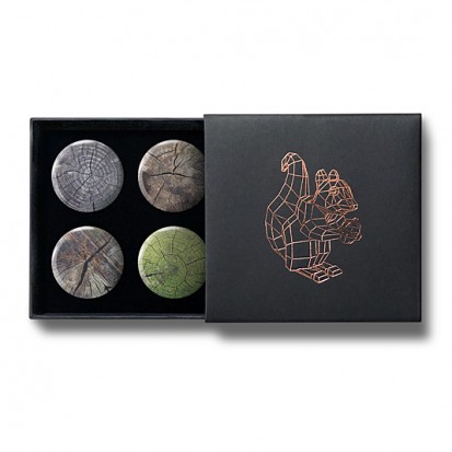This elegant matchbox-style gift box contains four designs from Stereohype's growing button badge collection – now available for the first time in this superb packaging solution. A rose-gold foil-blocked Stereohype mascot squirrel was hand-printed in the UK at the top of the gift box (outside dimensions: 75 x 72 x 16mm). Inside the beautiful matt black cardboard gift box is a black flock pad and badges are directly pinned into it. All Stereohype button badges available at stereohype.com are classic high quality one inch (25mm) metal back badges with so-called D-pin (although it looks more like an 'e'). Tiny stickers at the back of each button badge mention the artist, release date, series number, etc. Badges are manufactured with love and care in the United Kingdom.
