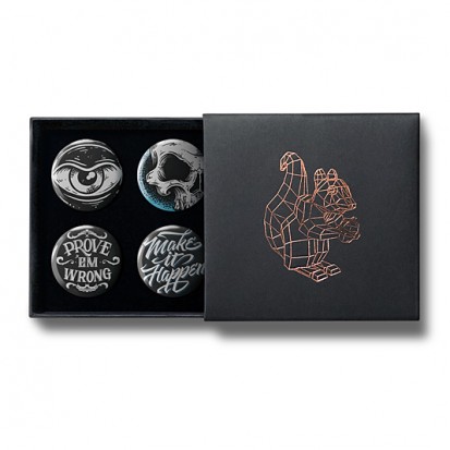 This elegant matchbox-style gift box contains four designs from Stereohype's growing button badge collection – now available for the first time in this superb packaging solution. A rose-gold foil-blocked Stereohype mascot squirrel was hand-printed in the UK at the top of the gift box (outside dimensions: 75 x 72 x 16mm). Inside the beautiful matt black cardboard gift box is a black flock pad and badges are directly pinned into it. All Stereohype button badges available at stereohype.com are classic high quality one inch (25mm) metal back badges with so-called D-pin (although it looks more like an 'e'). Tiny stickers at the back of each button badge mention the artist, release date, series number, etc. Badges are manufactured with love and care in the United Kingdom.