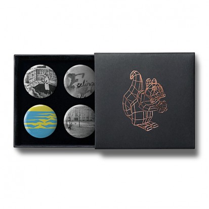 This elegant matchbox-style gift box contains four designs from Stereohype's growing button badge collection – now available for the first time in this superb packaging solution. A rose-gold foil-blocked Stereohype mascot squirrel was hand-printed in the UK at the top of the gift box (outside dimensions: 75 x 72 x 16mm). Inside the beautiful matt black cardboard gift box is a black flock pad and badges are directly pinned into it. All Stereohype button badges available at stereohype.com are classic high quality one inch (25mm) metal back badges with so-called D-pin (although it looks more like an 'e'). Tiny stickers at the back of each button badge mention the artist, release date, series number, etc. Badges are manufactured with love and care in the United Kingdom.