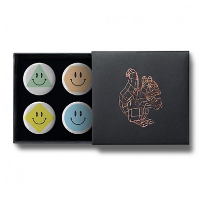This elegant matchbox-style gift box contains four designs from Stereohype's growing button badge collection – now available for the first time in this superb packaging solution. A rose-gold foil-blocked Stereohype mascot squirrel was hand-printed in the UK at the top of the gift box (outside dimensions: 75 x 72 x 16mm). Inside the beautiful matt black cardboard gift box is a black flock pad and badges are directly pinned into it. All Stereohype button badges available at stereohype.com are classic high quality one inch (25mm) metal back badges with so-called D-pin (although it looks more like an 'e'). Tiny stickers at the back of each button badge mention the artist, release date, series number, etc. Badges are manufactured with love and care in the United Kingdom.