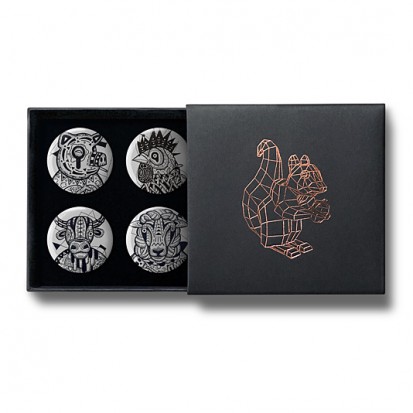 This elegant matchbox-style gift box contains four designs from Stereohype's growing button badge collection – now available for the first time in this superb packaging solution. A rose-gold foil-blocked Stereohype mascot squirrel was hand-printed in the UK at the top of the gift box (outside dimensions: 75 x 72 x 16mm). Inside the beautiful matt black cardboard gift box is a black flock pad and badges are directly pinned into it. All Stereohype button badges available at stereohype.com are classic high quality one inch (25mm) metal back badges with so-called D-pin (although it looks more like an 'e'). Tiny stickers at the back of each button badge mention the artist, release date, series number, etc. Badges are manufactured with love and care in the United Kingdom.