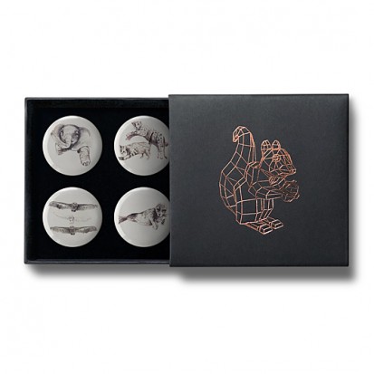This elegant matchbox-style gift box contains four designs from Stereohype's growing button badge collection – now available for the first time in this superb packaging solution. A rose-gold foil-blocked Stereohype mascot squirrel was hand-printed in the UK at the top of the gift box (outside dimensions: 75 x 72 x 16mm). Inside the beautiful matt black cardboard gift box is a black flock pad and badges are directly pinned into it. All Stereohype button badges available at stereohype.com are classic high quality one inch (25mm) metal back badges with so-called D-pin (although it looks more like an 'e'). Tiny stickers at the back of each button badge mention the artist, release date, series number, etc. Badges are manufactured with love and care in the United Kingdom.