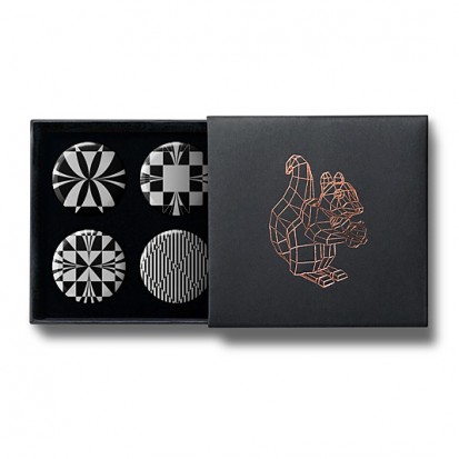 This elegant matchbox-style gift box contains four designs from Stereohype's growing button badge collection – now available for the first time in this superb packaging solution. A rose-gold foil-blocked Stereohype mascot squirrel was hand-printed in the UK at the top of the gift box (outside dimensions: 75 x 72 x 16mm). Inside the beautiful matt black cardboard gift box is a black flock pad and badges are directly pinned into it. All Stereohype button badges available at stereohype.com are classic high quality one inch (25mm) metal back badges with so-called D-pin (although it looks more like an 'e'). Tiny stickers at the back of each button badge mention the artist, release date, series number, etc. Badges are manufactured with love and care in the United Kingdom.