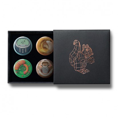 This elegant matchbox-style gift box contains four designs from Stereohype's growing button badge collection – now available for the first time in this superb packaging solution. A rose-gold foil-blocked Stereohype mascot squirrel was hand-printed in the UK at the top of the gift box (outside dimensions: 75 x 72 x 16mm). Inside the beautiful matt black cardboard gift box is a black flock pad and badges are directly pinned into it. All Stereohype button badges available at stereohype.com are classic high quality one inch (25mm) metal back badges with so-called D-pin (although it looks more like an 'e'). Tiny stickers at the back of each button badge mention the artist, release date, series number, etc. Badges are manufactured with love and care in the United Kingdom.