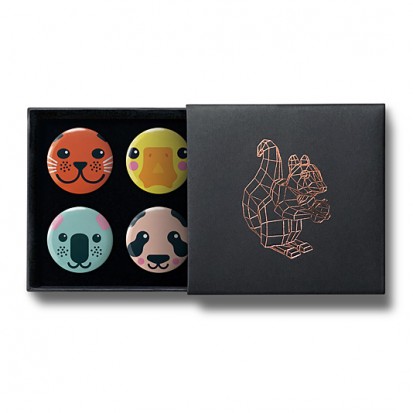 This elegant matchbox-style gift box contains four designs from Stereohype's growing button badge collection – now available for the first time in this superb packaging solution. A rose-gold foil-blocked Stereohype mascot squirrel was hand-printed in the UK at the top of the gift box (outside dimensions: 75 x 72 x 16mm). Inside the beautiful matt black cardboard gift box is a black flock pad and badges are directly pinned into it. All Stereohype button badges available at stereohype.com are classic high quality one inch (25mm) metal back badges with so-called D-pin (although it looks more like an 'e'). Tiny stickers at the back of each button badge mention the artist, release date, series number, etc. Badges are manufactured with love and care in the United Kingdom.