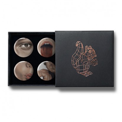 This elegant matchbox-style gift box contains four designs from Stereohype's growing button badge collection – now available for the first time in this superb packaging solution. A rose-gold foil-blocked Stereohype mascot squirrel was hand-printed in the UK at the top of the gift box (outside dimensions: 75 x 72 x 16mm). Inside the beautiful matt black cardboard gift box is a black flock pad and badges are directly pinned into it. All Stereohype button badges available at stereohype.com are classic high quality one inch (25mm) metal back badges with so-called D-pin (although it looks more like an 'e'). Tiny stickers at the back of each button badge mention the artist, release date, series number, etc. Badges are manufactured with love and care in the United Kingdom.