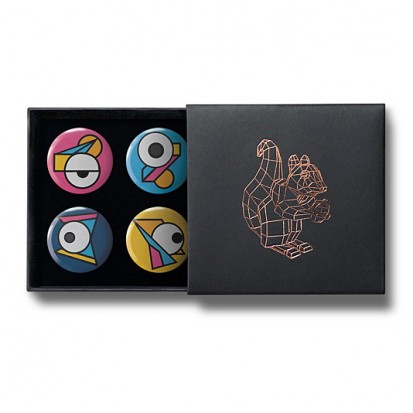 This elegant matchbox-style gift box contains four designs from Stereohype's growing button badge collection – now available for the first time in this superb packaging solution. A rose-gold foil-blocked Stereohype mascot squirrel was hand-printed in the UK at the top of the gift box (outside dimensions: 75 x 72 x 16mm). Inside the beautiful matt black cardboard gift box is a black flock pad and badges are directly pinned into it. All Stereohype button badges available at stereohype.com are classic high quality one inch (25mm) metal back badges with so-called D-pin (although it looks more like an 'e'). Tiny stickers at the back of each button badge mention the artist, release date, series number, etc. Badges are manufactured with love and care in the United Kingdom.