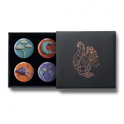 This elegant matchbox-style gift box contains four designs from Stereohype's growing button badge collection – now available for the first time in this superb packaging solution. A rose-gold foil-blocked Stereohype mascot squirrel was hand-printed in the UK at the top of the gift box (outside dimensions: 75 x 72 x 16mm). Inside the beautiful matt black cardboard gift box is a black flock pad and badges are directly pinned into it. All Stereohype button badges available at stereohype.com are classic high quality one inch (25mm) metal back badges with so-called D-pin (although it looks more like an 'e'). Tiny stickers at the back of each button badge mention the artist, release date, series number, etc. Badges are manufactured with love and care in the United Kingdom.