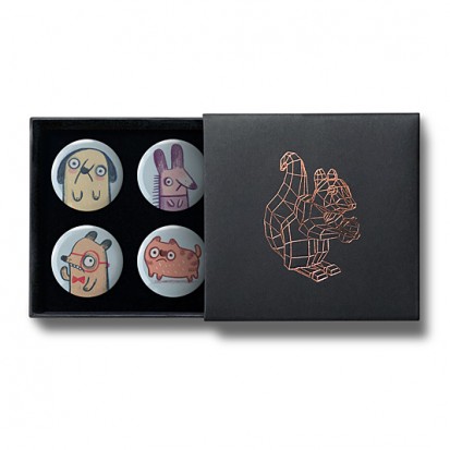 This elegant matchbox-style gift box contains four designs from Stereohype's growing button badge collection – now available for the first time in this superb packaging solution. A rose-gold foil-blocked Stereohype mascot squirrel was hand-printed in the UK at the top of the gift box (outside dimensions: 75 x 72 x 16mm). Inside the beautiful matt black cardboard gift box is a black flock pad and badges are directly pinned into it. All Stereohype button badges available at stereohype.com are classic high quality one inch (25mm) metal back badges with so-called D-pin (although it looks more like an 'e'). Tiny stickers at the back of each button badge mention the artist, release date, series number, etc. Badges are manufactured with love and care in the United Kingdom.
