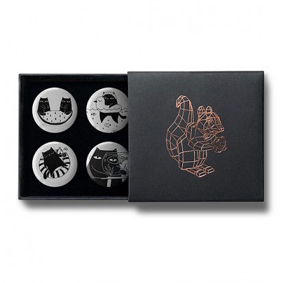 This elegant matchbox-style gift box contains four designs from Stereohype's growing button badge collection – now available for the first time in this superb packaging solution. A rose-gold foil-blocked Stereohype mascot squirrel was hand-printed in the UK at the top of the gift box (outside dimensions: 75 x 72 x 16mm). Inside the beautiful matt black cardboard gift box is a black flock pad and badges are directly pinned into it. All Stereohype button badges available at stereohype.com are classic high quality one inch (25mm) metal back badges with so-called D-pin (although it looks more like an 'e'). Tiny stickers at the back of each button badge mention the artist, release date, series number, etc. Badges are manufactured with love and care in the United Kingdom.