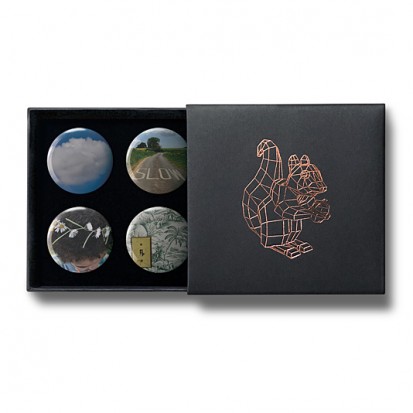This elegant matchbox-style gift box contains four designs from Stereohype's growing button badge collection – now available for the first time in this superb packaging solution. A rose-gold foil-blocked Stereohype mascot squirrel was hand-printed in the UK at the top of the gift box (outside dimensions: 75 x 72 x 16mm). Inside the beautiful matt black cardboard gift box is a black flock pad and badges are directly pinned into it. All Stereohype button badges available at stereohype.com are classic high quality one inch (25mm) metal back badges with so-called D-pin (although it looks more like an 'e'). Tiny stickers at the back of each button badge mention the artist, release date, series number, etc. Badges are manufactured with love and care in the United Kingdom.