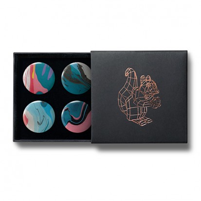 This elegant matchbox-style gift box contains four designs from Stereohype's growing button badge collection – now available for the first time in this superb packaging solution. A rose-gold foil-blocked Stereohype mascot squirrel was hand-printed in the UK at the top of the gift box (outside dimensions: 75 x 72 x 16mm). Inside the beautiful matt black cardboard gift box is a black flock pad and badges are directly pinned into it. All Stereohype button badges available at stereohype.com are classic high quality one inch (25mm) metal back badges with so-called D-pin (although it looks more like an 'e'). Tiny stickers at the back of each button badge mention the artist, release date, series number, etc. Badges are manufactured with love and care in the United Kingdom.