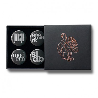 This elegant matchbox-style gift box contains four designs from Stereohype's growing button badge collection – now available for the first time in this superb packaging solution. A rose-gold foil-blocked Stereohype mascot squirrel was hand-printed in the UK at the top of the gift box (outside dimensions: 75 x 72 x 16mm). Inside the beautiful matt black cardboard gift box is a black flock pad and badges are directly pinned into it. All Stereohype button badges available at stereohype.com are classic high quality one inch (25mm) metal back badges with so-called D-pin (although it looks more like an 'e'). Tiny stickers at the back of each button badge mention the artist, release date, series number, etc. Badges are manufactured with love and care in the United Kingdom.